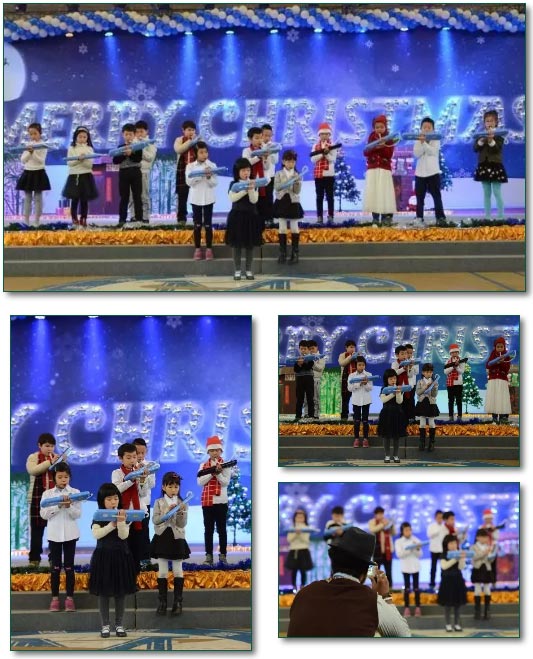 一年級孩子們帶給我們的舞蹈“All I Want for Christmas is You’以后,三年級的同學(xué)為我們演奏了口風(fēng)琴樂曲“Deck the Hall”與“Jingle Bells”