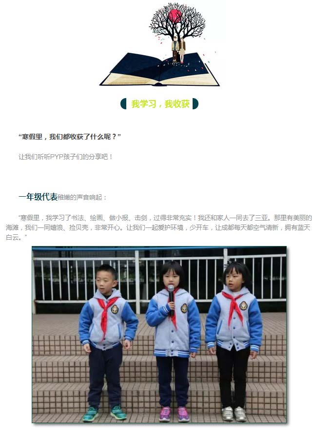 踏著春的節拍,帶著欣然的笑容,IB-PYP的全體師生聚集在國旗下,共同分享假期生活,開始了新學期的開學第一課——“運動、健康、學習、收獲,做幸福的孩子!”