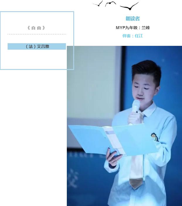 在九年級的蘭峰同學心中,朗讀可以用來宣泄自己內心的情感,因此他選擇法國詩人艾呂雅的《自由》來表達自己內心對“自由”的呼喚。