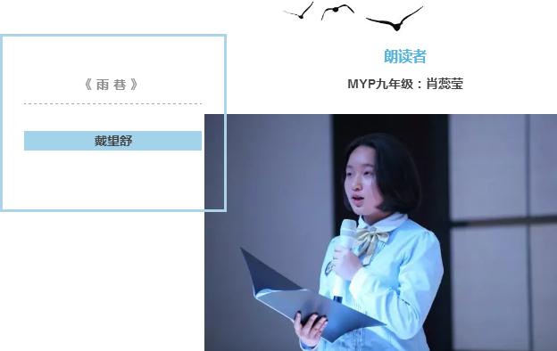 在她的朗讀聲中,朦朧而又幽深的雨巷里走來一位像丁香一樣結著愁怨的姑娘, 那份既迷惘感傷又滿是期待的情懷,著實感染了現場所有觀眾。