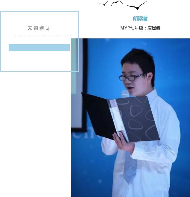 七年級的唐晟垚同學也曾充滿困惑,當他讀到一首連題目也沒有的短詩時,卻無法忘記詩中那種激勵自己的力量,他想把這種力量分享出來,給更多人以力量。