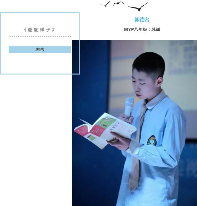 八年級的蘇適同學來自北京,他將祥子在暴雨中艱難拉車的場景朗讀給大家,他用純正的北京口音給片段描寫帶上了濃濃的京腔京韻,博得陣陣喝彩。