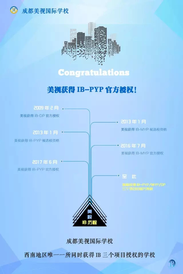 成都美視師一學校前身為成都美視學校,是成都市首批老牌民辦學校。學校于2002年經四川省教育廳批準投資建成,是一所從幼兒園至高中全學段的國家課程和融合教育雙軌制、K12、高品質、寄宿式的私立學校。辦學以來,學校一直堅持多元化教育,融合創新,取得了令人矚目的辦學成績,獲得了IB(國際文憑)授權,并通過了美國中部院校聯盟(MSA-CESS)、美國私立學校委員會(NCPAS)及認證國際(Ai)等世界領先教育機構的資格認證。同時,我們也獲得了美國大學理事會(College Board)授權開設AP課程,成為真正享有世界認可的國際學校。