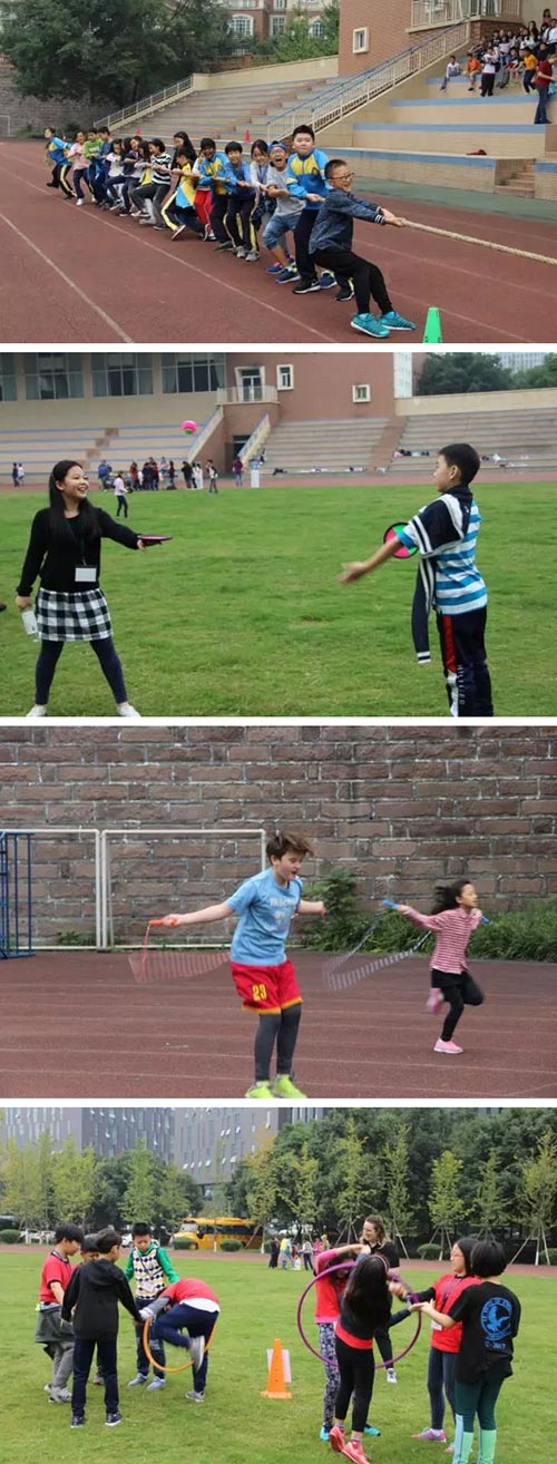 兩人三足、“手推車”比賽、拔河比賽也在操場上展開著。