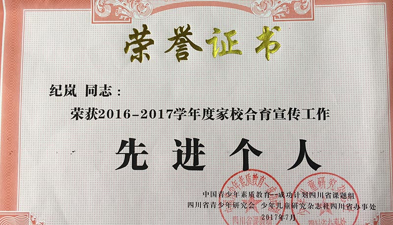 祝賀紀嵐校長榮獲2016-2017學年度家校合育宣傳工作先進個人