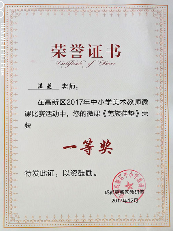 祝賀溫菱老師在高新區2017年中小學美術教師微課比賽活動中榮獲一等獎