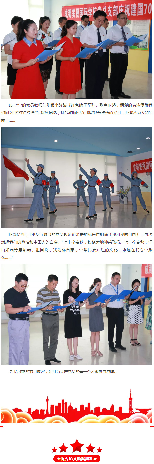 中國部•小學全體黨員教師帶來的配樂詩朗誦《祖國頌》,讓我們感受到我們祖國七十年的風雨兼程、波瀾壯闊和輝煌壯麗。一句句“我愛您,祖國。”飽含對萬里江山、綠水青山和長江黃河的熱愛。