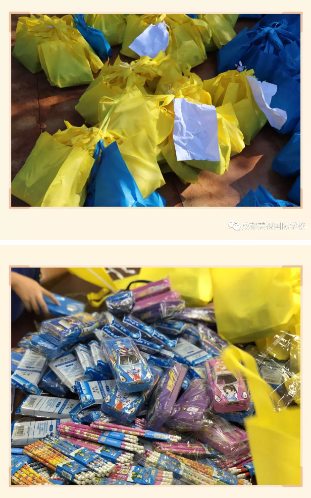 特別感謝3.1班祝沁馨媽媽和3.2班劉信霆媽媽購買和分裝禮物。雖然,袋子里只有一個簡單的文具盒、一套尺子、幾支筆……但是確承載著每一個美視孩子對清風孩子的那一份愛的分享。