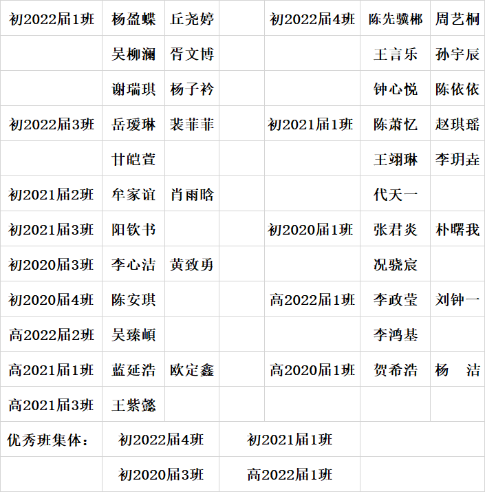 以下這些同學和班集體的學習、體育成績和相關條件都符合高新區評優文件規定,成為高新區三好學生、優干及優秀班集體候選人,現公示如下: