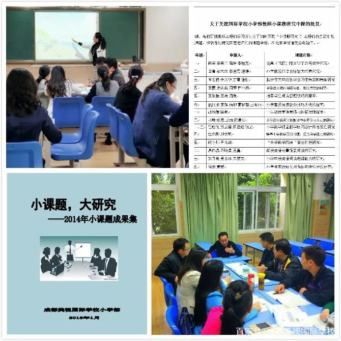 做小課題研究,便于資料的收集與內容的撰寫,有利于把宏觀的決策轉化為微觀的課堂教學操作技術。《小學中段群文閱讀教學研究》、《利用思維導圖引導進行高段英語段落寫作的研究》、《小學數(shù)學教材的內容選擇與呈現(xiàn)方式的研究》……圍繞著亟待解決的問題,我們思考著、實踐著,把自己的感悟撰寫成一篇篇教學論文、案例、隨筆。