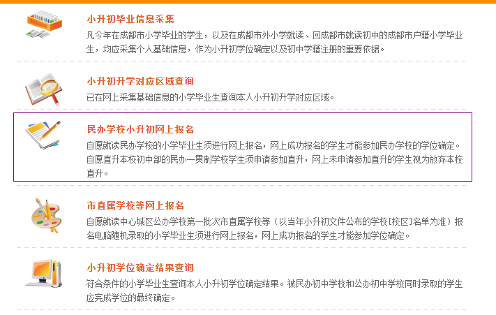 1、登陸“成都市小升初服務平臺”后,選擇“民辦學校小升初網上報名”。