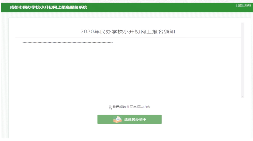 2、請仔細閱讀 “2020年民辦學校小升初網上報名須知”內容。閱讀完畢后勾選“我已閱讀并同意須知內容”,并點擊“填報民辦初中”。