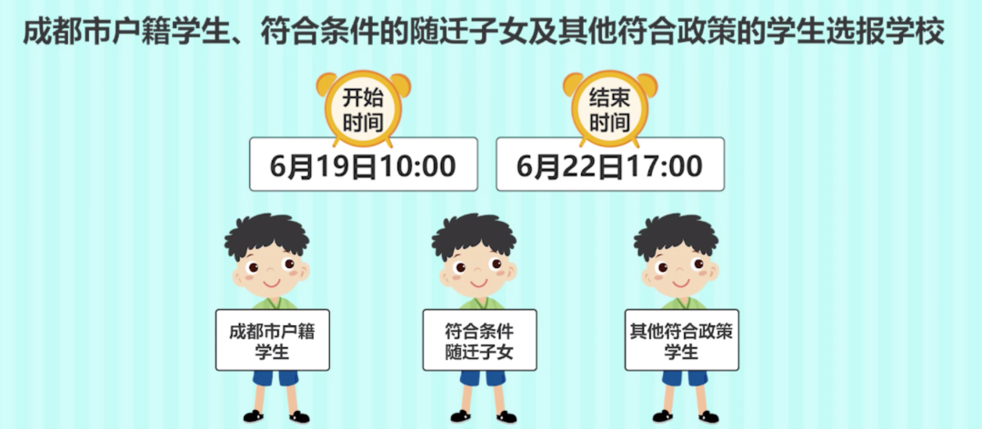 2020年6月19日10:00-6月22日17:00,成都市戶籍學生、符合條件的隨遷子女及其他符合政策的學生進行民辦初中網上報名。