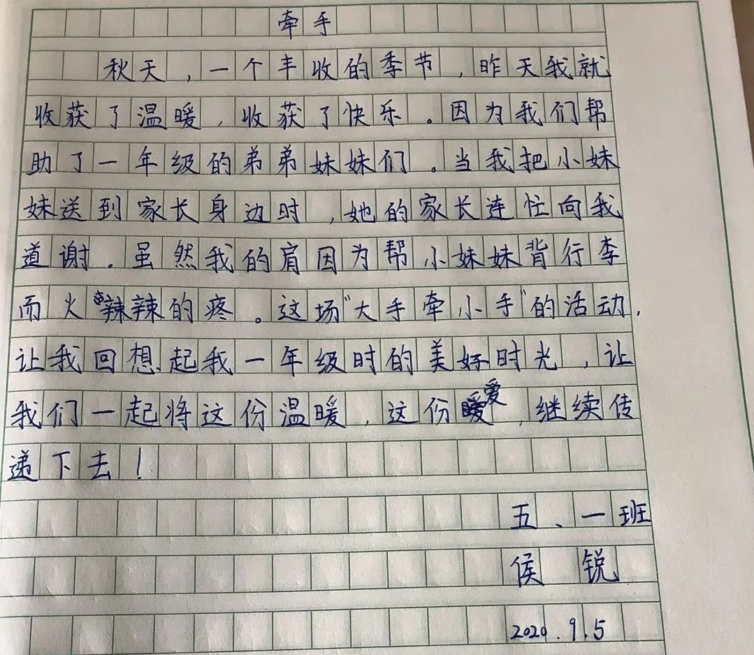 這次“大手牽小手”活動我感覺我從別人幫助我漸漸轉(zhuǎn)變成了我?guī)椭鷦e人。牽著一年級小朋友的小手時我覺得自己長大了。當(dāng)他用稚嫩的聲音給我說謝謝時,我頓時感到心中暖暖的。