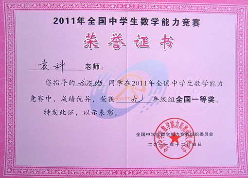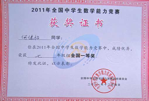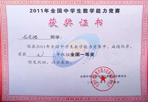 龍沉潛、何健怡同學在2011年全國中學生數(shù)學能力競賽中,成績優(yōu)異,分別榮獲九年級、七年級組全國一等獎。
