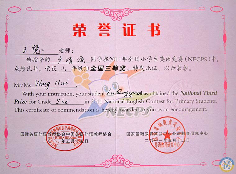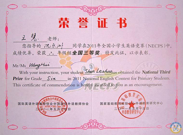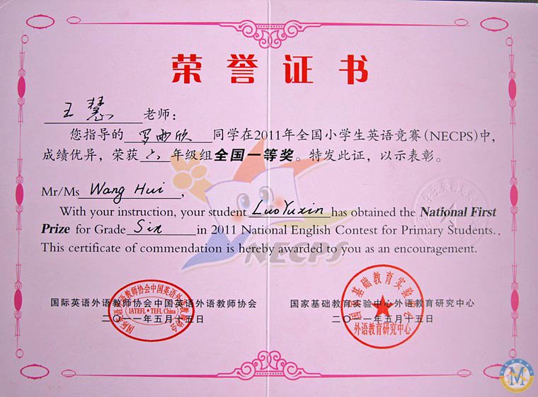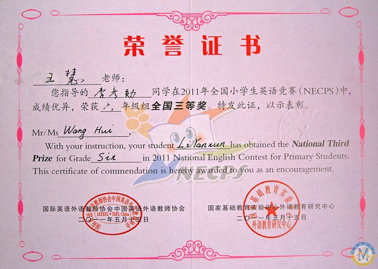在2011年全國小學生英語競賽中,王慧老師指導學生盧清源、沈樂洲、李彥勛榮獲全國三等獎,羅雨欣同學獲全國一等獎。