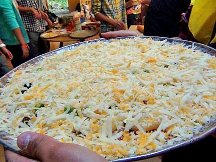 第三步:放材料。往比薩上撒了兩罐如番茄汗的不明液體,然后就開始放菜,其中最好玩的就是削起司,一塊磚頭大小,使勁削呀削,一個人拿不住,兩個人合作弄,我們削了一大盤起司,整個比薩上全是起司。