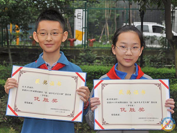 ▲ 劉文濤、張詩穎同學榮獲-成都市高新區“第二屆少兒才藝大賽”器樂比賽比賽優勝獎