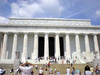 仿古希臘巴特農神廟式樣的林肯紀念堂是為紀念美國第16任總統亞伯拉罕·林肯而建造的。紀念堂于1914年破土動工,完成于1922年。紀念堂的 北墻上刻寫著林肯的第二次就職演說,南墻上刻寫著他的著名的葛底斯堡演說。林肯坐像的上方刻著五行大字"在這座殿堂內,正如在人民的心中,為了人民,他拯 救了聯邦。對于亞伯拉罕·林肯的紀念永遠長存"看著他我卻想的是和他有關系的電影"國家寶藏2"真希望它不要讓我失望。林肯紀念堂下面是一個長方形的人工 湖,在陽光下紀念碑的影子會完全倒映在湖水中,所以人稱碑影湖。而它的英文名字 reflecting pool有反醒的意思。不知是不是也真有這個意思?! 記得阿甘哥和珍尼在反戰中這湖里有浪漫的一吻。