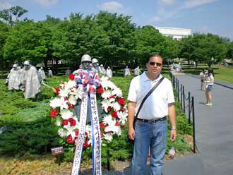 美國獨立宣言的撰稿人之一,第三任總統杰佛遜紀念堂就在著名的阿靈頓國家公墓,這里埋葬著自南北戰爭以來陣亡的將士和部分因公殉職的國家公務員, 包括遇刺的肯尼迪。不遠處的朝鮮戰爭紀念碑墻前塑立著19位呈戰斗隊列行走士兵的雕塑群像,每個士兵都穿著風雨衣,感覺正在冰天雪地中凄苦行進,每張臉上 的表情都是無奈與彷徨,全然沒有一點崇高神圣的感覺。在雕塑旁邊的地面上記錄著戰爭的時間與傷亡數字。57年前那場意識形態差異的戰爭被美國人無奈的叫作 遺忘的戰爭。我們中國人對它也有極其深刻的印象,雄糾糾氣昂昂跨過鴨綠江到上甘嶺的慘烈廝殺,都是我們從小就耳熟能詳的。對面的越南戰爭紀念碑身長15 米,高3米,由21歲的華裔林櫻設計,非常的簡潔,基色是黑色大理石,由兩塊三角拼在一起組成,三角的中間地勢底,兩邊高,無論從哪一邊參觀,都會有同樣 的感覺。那就是走入戰爭如同走向死亡的墳墓,越陷越深。美軍陣亡將士的名字按字母排序,密密麻麻的刻在墻上,記錄了58132名美軍陣亡將士的名單。在參 觀的時候,有幾家美國人正在祭奠自己的親人,一束鮮花,一支蠟燭,一張照片,老照片上的人依舊年輕,沒有淚水,但是那撫摩著碑墻的手卻布滿皺 紋........