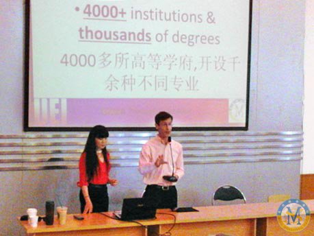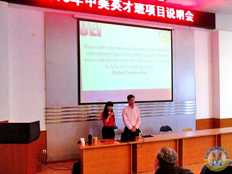 為了讓廣大初三考生以及家長更清楚的了解美視--中美英才班的相關信息,如課程背景,課程設置,教師陣容,教材安排等,中美英才班2013-2014學年招生說明會于4月20日下午在美視學術廳隆重舉行。UEI總裁Dan Plaut 先生以提問的方式進入主題,如:未來的世界是什么樣?誰將會成為成功者?誰的幸福指數更高?誰會得到更多的就業機會?誰會真正享受世界為我們提供的一切?等等。通過這些問題,將在座的聽眾帶進一個國際化的世界。之后,Dan Plaut 先生為學生以及家長介紹了美國大學的教育體制,以及該課程為學生從學術,文化等方面提供的準備。Dan Plaut先生的演講過后,美視中學部徐校長就該課程近一年的開展情況作了詳細全面的闡述,徐校長在講述中多次引用習語,典故,講解十分精彩,進一步鼓舞了在座家長以及學生對該課程的信心。最后,Dan Plau先生和徐校長聯合答疑,從點到面,面面俱到,整場招生說明會精彩至極。