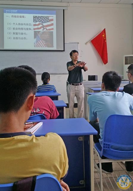 2014年7月15日上午10點50分,四川大學歷史文化學院的周教授受邀來訪中美英才班。本月中美英才班的高二同學們正在上暑期課程,UEI的總裁Dan Plaut和總監Misha Cao為了豐富同學們的課程內容,在炎炎夏日增添一些樂趣,特意邀請了四川大學的周教授為大家帶來一場以“中美文化對比”為主題的實用又幽默的演講。周教授以其豐富的海外人生閱歷、充實的演講內容、生動幽默的演講方式贏得在座師生的陣陣掌聲與笑聲,最重要的是拓寬、刷新了同學們對美國社會、美國文化的認知。演講結束時,整個教室爆發出熱烈而持久的掌聲,表達了對周教授的演講的喜愛和謝意。