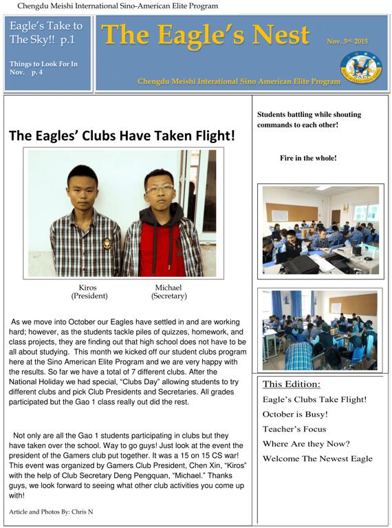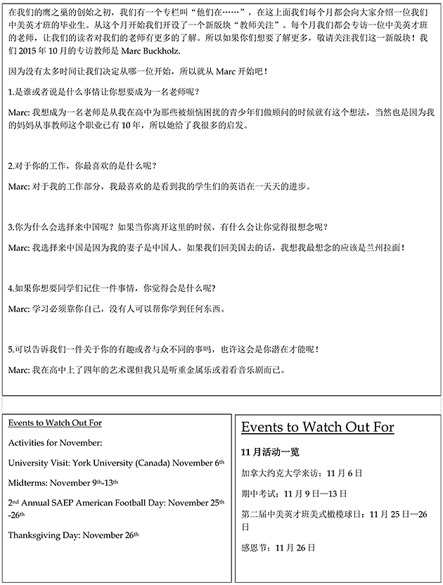 我們的同學(xué)們都已習(xí)慣了繁重的課程和作業(yè),而這個月由于我們的俱樂部活動的開展將使他們更加忙碌!但是對我們的同學(xué)們來說,還有很多事情等著他們。申請大學(xué),個人陳述,托福和雅思考試預(yù)備班等。此外,高三的同學(xué)們必須在10月22日之前完成他們申請大學(xué)的個人陳述。全年級同學(xué)都參加了為期兩天的美視運動會。之后所有同學(xué)們也參加了由國外150多所院校舉辦的2015中國國際教育展成都站的展會。十月底同學(xué)們將參加中美英才班舉辦的最膽戰(zhàn)心驚的萬圣節(jié)活動。中美英才班同學(xué)們將帶來服裝展和帶有萬圣節(jié)氣氛的舞蹈以及其他的活動。我們將會把這次活動的照片刊登在我們11月版的鷹之巢上。