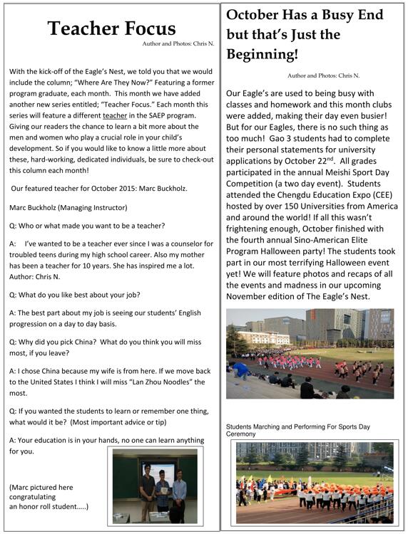 在我們的鷹之巢的創(chuàng)始之初,我們有一個專欄叫“他們在……”,在這上面我們每個月都會向大家介紹一位我們中美英才班的畢業(yè)生。從這個月開始我們開設(shè)了一個新版塊“教師關(guān)注”。每個月我們都會專訪一位中美英才班的老師,讓我們的讀者對我們的老師有更多的了解。所以如果你們想要了解更多,敬請關(guān)注我們這一新版塊!我們2015年10月的專訪教師是Marc Buckholz.
