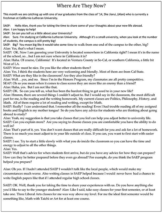 本月我們訪問到了來自2014屆的畢業(yè)生Alan佘家瑞,他現(xiàn)在是加州路德大學(xué)的一名大一新生。