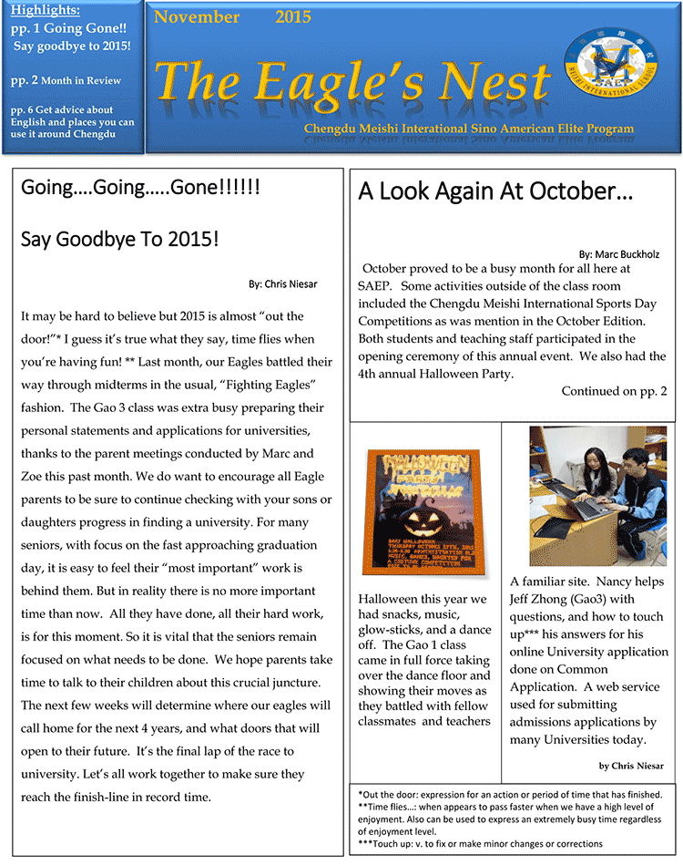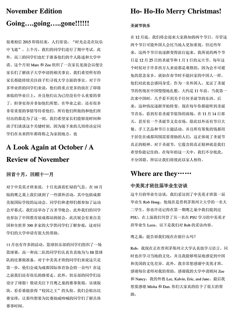 很難相信2015即將結束,人們常說:“時光總是在玩樂中飛逝”。上個月,我們的同學們進行了期中考試。此外,高三的同學們也忙于準備他們的個人陳述和大學申請。這個月初Marc和Zoe組織了一次家長見面會以便讓家長們了解孩子大學申請的相關事宜。我們希望所有的家長都能持續關注孩子們尋找大學方面的事宜。對于許多畢業班的同學們來說,他們將重點更多的放在了即將來臨的畢業日上,并且他們認為已經沒有什么重要的事了,但事實卻并非如他們所想。在畢業之前,還有很多非常重要的事情等待著他們。所有他們所做的和他們所付出的都是為了這一刻。我們希望家長們能夠花時間和孩子們談談這個關鍵時刻。因為接下來的幾周將決定同學們在未來四年都將稱之為家的地方,也將決定開啟怎樣的未來之門。這是邁向大學的最后沖刺,讓我們齊心協力確保他們能在有限的時間里快速地完成他們的大學申請。