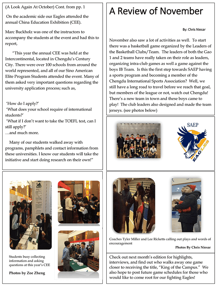 11月也有許多的活動。籃球俱樂部的同學們組織了一場籃球賽,高一和高二隊的同學們認真負責地為與IB籃球隊的比賽做準備。對于中美英才班的同學們來說這只是第一步,他們會成為成都國際體育協會的一員嗎?在這之前我們還有很長的路要走。此外,俱樂部的同學們還設計了球服!