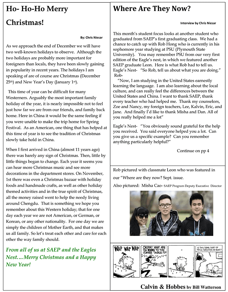在12月底,我們將會迎來大家熟知的兩個節日。盡管這兩個節日可能外國人會比當地人更加重視。但近些年來,這兩個節日也逐漸變得流行起來。我所說的兩個節日是12月25日的圣誕節和1月1日的元旦節。每年這個時候對于許多西方人來說都是難熬的,因為會不可避免的思念家鄉,就如在春節時不能回家的中國人一樣,他們對此也會感同身受。作為一名外國人,見證了圣誕節的傳統在中國慢慢地扎根。大約是11年前,當我第一次來中國時,幾乎看不到任何關于圣誕節的東西。后來,這種情況逐漸開始轉變?,F在每年你都能聽到圣誕節音樂,看到有著圣誕節裝飾的商場。在11月14日當天,甚至有一個圣誕節義賣市場。除此以外還有節日大餐、手工藝品和節日主題活動。并且所有籌集的錢都用于居住在成都周圍需要幫助的人們,這正體現了圣誕節真正的精神。對于圣誕節,它蘊含的真正精神就是我們希望你能記住的。在每年的這一天中,我們不分彼此,不分國籍。所以讓我們將彼此以家人相待。