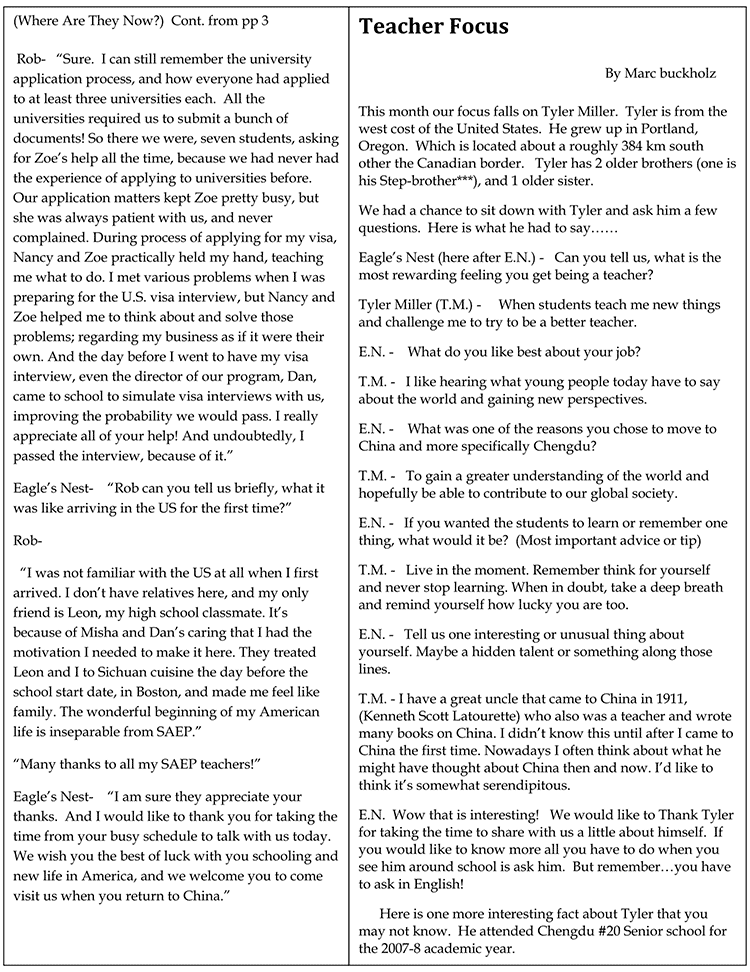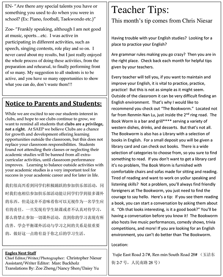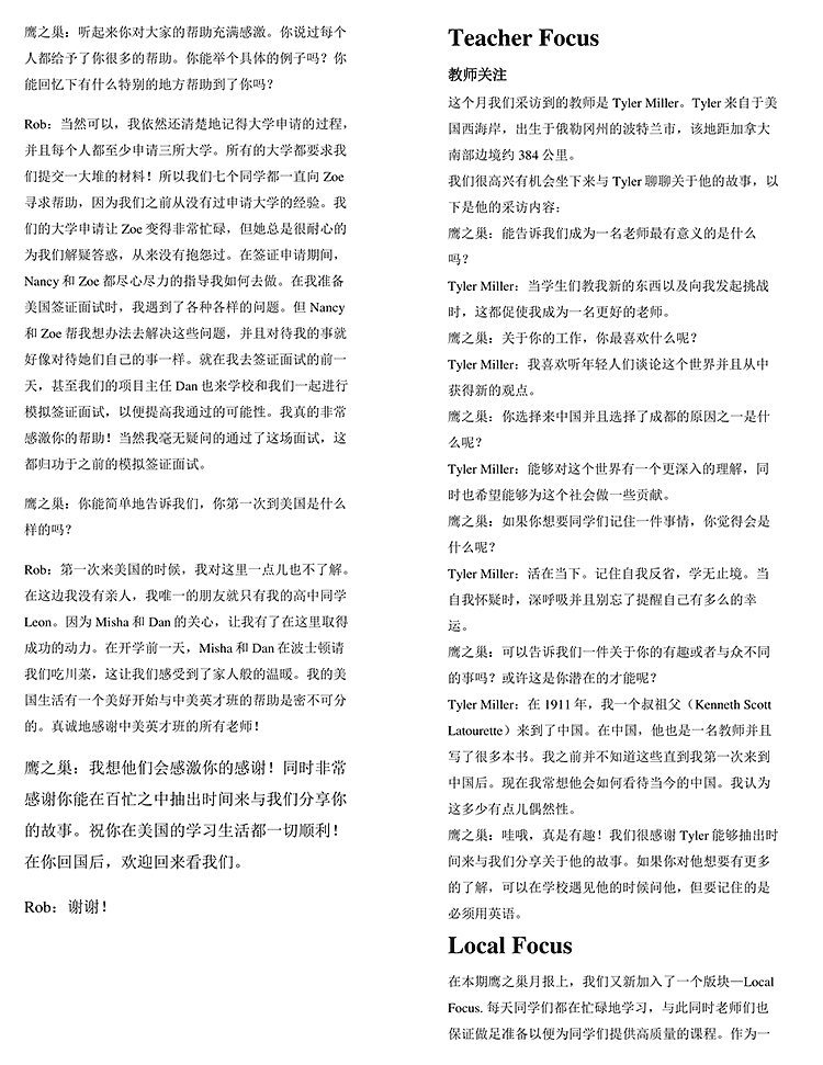 鷹之巢:哇哦,真是有趣!我們很感謝Tyler能夠抽出時間來與我們分享關于他的故事。如果你對他想要有更多的了解,可以在學校遇見他的時候問他,但要記住的是必須用英語。