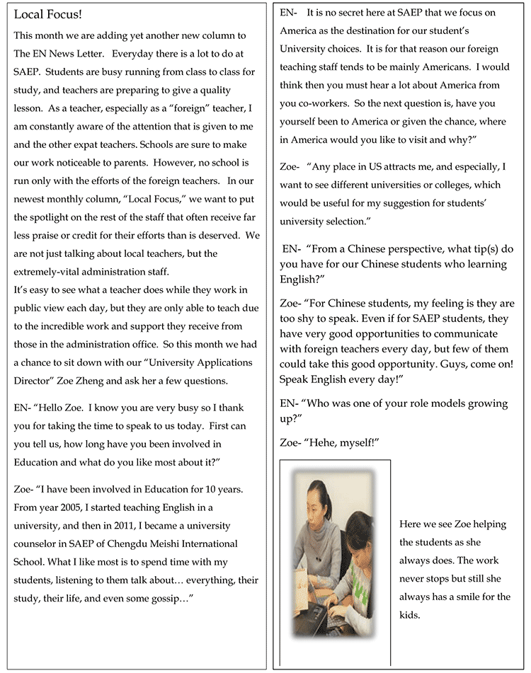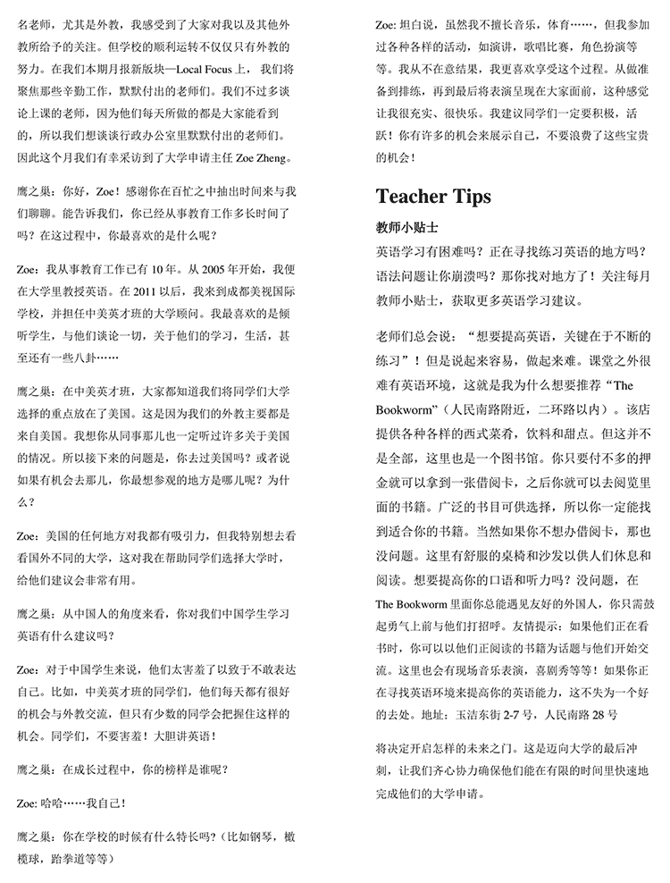 在本期鷹之巢月報上,我們又新加入了一個版塊—Local Focus. 每天同學們都在忙碌地學習,與此同時老師們也保證做足準備以便為同學們提供高質量的課程。作為一名老師,尤其是外教,我感受到了大家對我以及其他外教所給予的關注。但學校的順利運轉不僅僅只有外教的努力。在我們本期月報新版塊—Local Focus上, 我們將聚焦那些辛勤工作,默默付出的老師們。我們不過多談論上課的老師,因為他們每天所做的都是大家能看到的,所以我們想談談行政辦公室里默默付出的老師們。因此這個月我們有幸采訪到了大學申請主任Zoe Zheng。