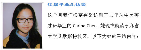 Carina: 我可以很肯定地說我在中美英才班所學到的讓我現在能夠流利且自信地講英語,至少在一定程度上是這樣的。講英語的時候,我也從來沒有感覺到很緊張。