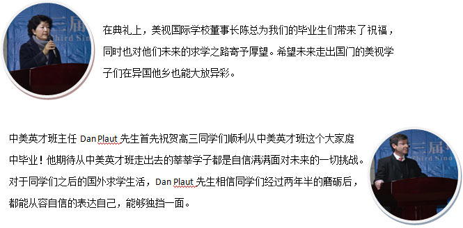 2016年1月19日,在國(guó)際部禮堂舉行了第三屆中美英才班畢業(yè)典禮,大家在此齊聚,共同為即將告別高中時(shí)代的畢業(yè)生們送上最真摯的祝福。 別離,是有點(diǎn)難舍,但不是悵然;   是有點(diǎn)遺憾,但不是悲觀(guān),因?yàn)槲覀冇邢喾甑南M诎参?,因?yàn)槲覀冎离x別是為了更好的相遇,為了遇見(jiàn)更好的自己。