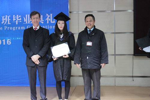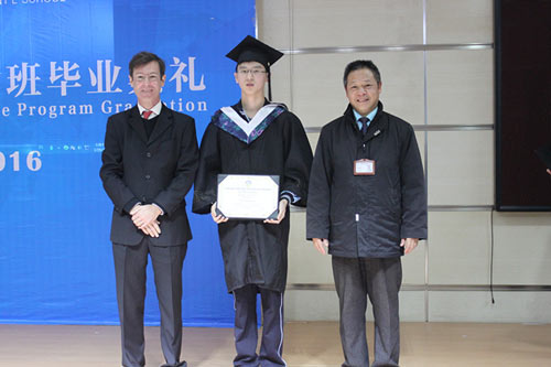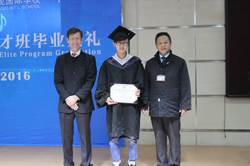 中美英才班主任Dan Plaut先生和美視中學(xué)部校長(zhǎng)徐德雄先生為2016級(jí)中美英才班畢業(yè)生們頒發(fā)結(jié)業(yè)證書(shū)
