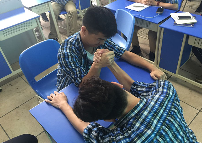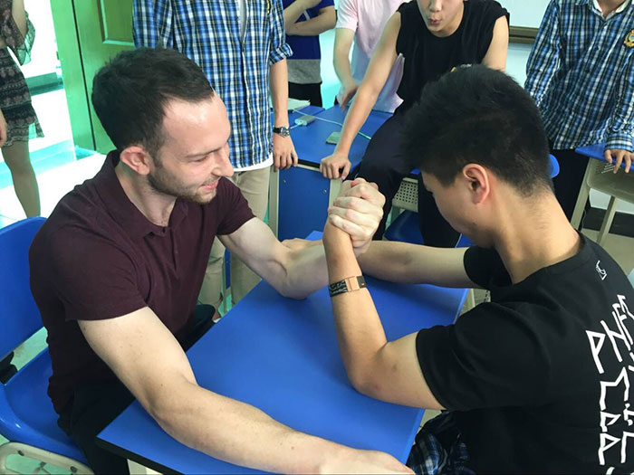 參賽者統(tǒng)一采用右手進(jìn)行比賽,雙方右手肘著臺(tái)面,并成一直線(xiàn)。左手可握住比賽臺(tái)上的握把,軀干不能觸及比賽臺(tái)。本次比賽由外教們作為裁判和比賽協(xié)調(diào)員。