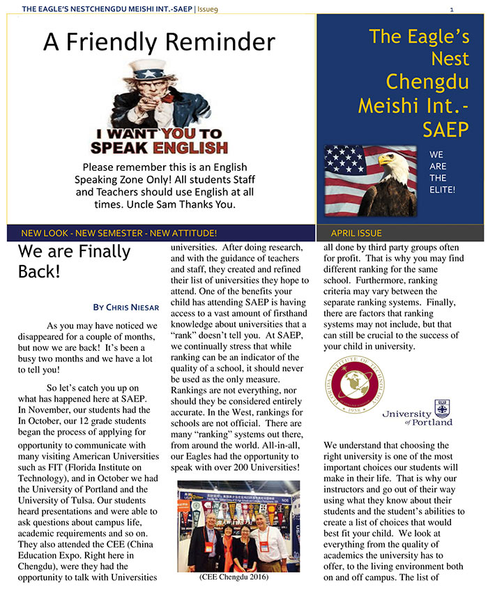 對于高一和高二年級的同學們來說,接下來的日子也并不輕松。雖然離他們的大學申請還有一兩年,但從現在開始了解、準備也是有必要的。我們也鼓勵同學們了解自己的興趣所在以及思考自己未來將要選擇什么專業。同時,我們也希望父母與同學們共同參與到大學申請中來,為孩子選擇最好的教育是每個父母的心愿,但一些家長卻認為只需要將孩子送進去,其他事情就交給學校負責。我們希望家長懂得事情遠不止這樣簡單。對于高一的家長,我們鼓勵您參與到孩子的學習過程中去,并且起到督促、引導的作用。