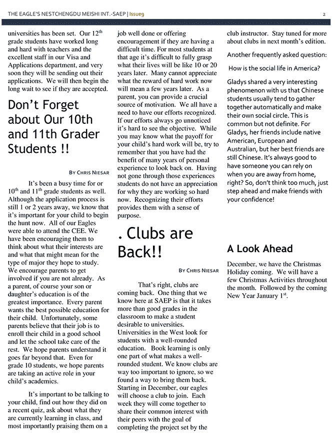 國外大學希望所招收的學生是綜合全面發展的。但書本知識只是全面發展的一個組成部分。課外實踐活動也是不可或缺的,而通常學生俱樂部的重要性卻往往容易被忽視,所以我們盡最大努力讓它繼續開展下去。從12月開始,同學們將自由選擇一個感興趣的俱樂部加入。每周,擁有共同興趣愛好的同學將一起完成由俱樂部老師安排的項目。更多俱樂部信息,請關注下期鷹之巢。