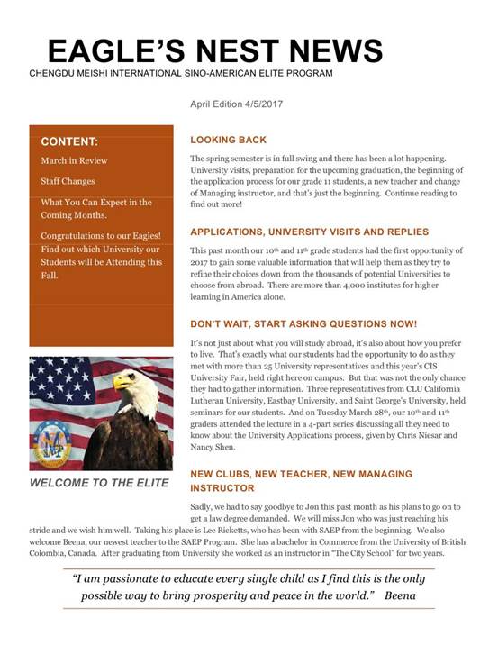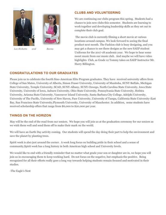 隨著春季學期的開始,中美英才班又有哪些新鮮事兒呢?多所國外大學來訪中美英才班、2017屆畢業生畢業典禮、高二同學們的大學申請、新外教的加入等等。